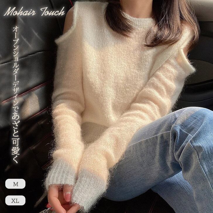 モヘア調 オープンショルダー 肌見せ トップス プルオーバー ニット